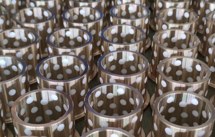 - Štruktúra: Otvory vyvŕtané na bronzovej matrici s povrchovým pokrytím ≤ 30 %, stĺpiky z PTFE zalisované, vytvárajúce konfiguráciu „pevného mazania s kovovou záťažou“